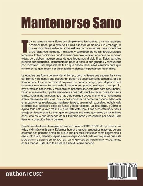 Tú y yo vamos a morir. Estos son simplemente los hechos, y no hay nada que podamos hacer para evitarlo. Es una cuestión de tiempo. Sin embargo, lo que es importante entender sobre esto es cómo viviremos nuestros últimos años hasta ese momento inevitable, y esto depende de las decisiones que tomemos. Estas decisiones pueden comenzar en cualquier momento de nuestras vidas, pero deben hacerse antes de que lleguemos al ciclo final. Estos cambios pueden ser pequeños, incrementarse poco a poco, o ser grandes y renovarnos por completo. Esto depende de ti. Lo que deben tener esos cambios para que funcionen es que deben ser alcanzables y plantear expectativas razonables. La edad es una forma de entender el tiempo, pero no tienes que esperar los ciclos del tiempo y no tienes que esperar un patrón de envejecimiento a medida que el tiempo pasa. La vida se cobrará su precio en nuestro cuerpo, pero depende de ti encontrar una forma de aprovecharla todo lo que puedas y alargar tu tiempo. Sí, hay formas de hacer esto, y realmente no necesitas leer este libro para descubrirlas. Están a tu alrededor, y probablemente las has oído muchas veces, quizá incluso a diario. Algunas de las cosas que has oído son que debes mantenerte físicamente activo realizando ejercicios, que debes comenzar a comer la comida adecuada en proporciones moderadas, mantener tu peso a un nivel razonable, reducir todo el estrés que puedas y dejar de fumar y beber alcohol. La lista sigue. ¿Cómo te ayuda todo esto a vivir más? De esto trata este libro. Leas o no este libro, vas a envejecer igualmente. Lo bien que envejezcas y lo sano que estés en tus últimos años, eso es lo que depende de ti. El tiempo pasa y no espera por nadie. Solo tiene una dirección: hacia delante. Este libro está dedicado a quienes quieren hacer el ESFUERZO de aprovechar su vida y vivir más y más sano. Debemos honrar y respetar a nuestros mayores, porque seremos esa persona antes de lo que imaginamos. Planificar cómo llegaremos a ese punto física, mental y espiritualmente depende de ti y de cómo quieras que esta progresión se plasme en tiempo real. La longevidad es literalmente, y solamente, en tus manos. Este libro te ayudará a decidir cómo hacerlo.