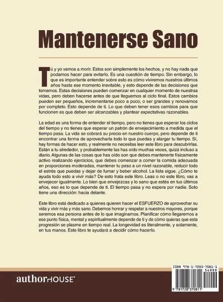Tú y yo vamos a morir. Estos son simplemente los hechos, y no hay nada que podamos hacer para evitarlo. Es una cuestión de tiempo. Sin embargo, lo que es importante entender sobre esto es cómo viviremos nuestros últimos años hasta ese momento inevitable, y esto depende de las decisiones que tomemos. Estas decisiones pueden comenzar en cualquier momento de nuestras vidas, pero deben hacerse antes de que lleguemos al ciclo final. Estos cambios pueden ser pequeños, incrementarse poco a poco, o ser grandes y renovarnos por completo. Esto depende de ti. Lo que deben tener esos cambios para que funcionen es que deben ser alcanzables y plantear expectativas razonables. La edad es una forma de entender el tiempo, pero no tienes que esperar los ciclos del tiempo y no tienes que esperar un patrón de envejecimiento a medida que el tiempo pasa. La vida se cobrará su precio en nuestro cuerpo, pero depende de ti encontrar una forma de aprovecharla todo lo que puedas y alargar tu tiempo. Sí, hay formas de hacer esto, y realmente no necesitas leer este libro para descubrirlas. Están a tu alrededor, y probablemente las has oído muchas veces, quizá incluso a diario. Algunas de las cosas que has oído son que debes mantenerte físicamente activo realizando ejercicios, que debes comenzar a comer la comida adecuada en proporciones moderadas, mantener tu peso a un nivel razonable, reducir todo el estrés que puedas y dejar de fumar y beber alcohol. La lista sigue. ¿Cómo te ayuda todo esto a vivir más? De esto trata este libro. Leas o no este libro, vas a envejecer igualmente. Lo bien que envejezcas y lo sano que estés en tus últimos años, eso es lo que depende de ti. El tiempo pasa y no espera por nadie. Solo tiene una dirección: hacia delante. Este libro está dedicado a quienes quieren hacer el ESFUERZO de aprovechar su vida y vivir más y más sano. Debemos honrar y respetar a nuestros mayores, porque seremos esa persona antes de lo que imaginamos. Planificar cómo llegaremos a ese punto física, mental y espiritualmente depende de ti y de cómo quieras que esta progresión se plasme en tiempo real. La longevidad es literalmente, y solamente, en tus manos. Este libro te ayudará a decidir cómo hacerlo.