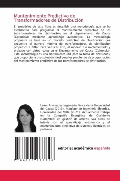 El propósito de este libro es describir una metodología que se ha establecido para programar el mantenimiento predictivo de los transformadores de distribución en el departamento de Cauca (Colombia) mediante aprendizaje automático. La metodología propuesta se basa en un modelo predictivo de clasificación que encuentra el número mínimo de transformadores de distribución propensos a fallar. Para verificar esto, el modelo fue implementado y probado con datos reales en el Departamento del Cauca (Colombia). Esta metodología es una herramienta útil para la toma de decisiones, que proporciona una solución ideal para los problemas de programación del mantenimiento predictivo de los transformadores de distribución.