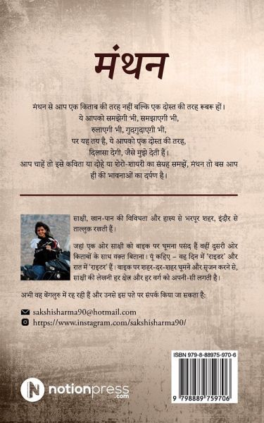 Manthan is a collection of short Hindi poetry that touches upon relatable highs and lows of modern day relationships. Author Bio Hailing from the city of food and humor Indore, Sakshi is a writer by night and a rider by day. Long distance riding has gifted her plethora time and experiences to channel the world around her in words.