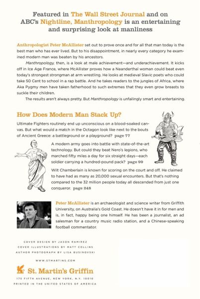 Featured in The Wall Street Journal and on ABC's Nightline, Manthropology is an entertaining and surprising look at manliness Anthropologist Peter McAllister set out to prove once and for all that man today is the best man who has ever lived. But to his disappointment, in nearly every category he examined modern man was beaten by his ancestors. Manthropology, then, is a look at male achievement-and underachievement. It kicks off in Ice Age France, where McAllister proves how a Neanderthal woman could beat even today's strongest strongman at arm wrestling. He looks at medieval Slavic poets who could take 50 Cent to school in a rap battle. And he takes readers to the jungles of Africa, where Aka Pygmy men have taken fatherhood to such extremes that they even grow breasts to suckle their children. For the modern man, the results aren't always pretty. But Manthropology is unfailingly smart and entertaining. How Does Modern Man Stack Up? Ultimate Fighters routinely end up on a blood-soaked canvas. But what would a match in the Octagon look like next to the bouts of Ancient Greece: a battleground or a playground? [Page 77] *** A modern army goes into battle with state-of-the-art technology. But could they have beaten Nero's legions, who marched fifty miles a day for six straight days-each soldier carrying a hundred-pound pack? [Page 99] *** Wilt Chamberlain is known for scoring on the court and off. He claimed to have had as many as 20,000 sexual encounters. But that's nothing compared to the 32 million people today all descended from just one conqueror. [Page 248]
