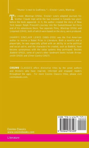 "Humor is next to Godliness." ¿ Sinclair Lewis, Mantrap To create Mantrap (1926), Sinclair Lewis adapted journals his brother Claude kept while the two traveled in Canada two years before the book appeared. In it, the author created the story of New York lawyer Ralph Prescott's journey into the Saskatchewan territory and of his adventures there. Two separate films, Mantrap (1926) and Untamed (1940), both of which were based on the story, were produced.