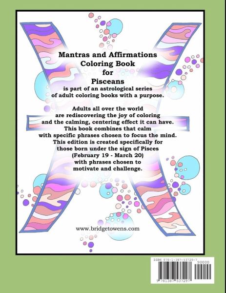 Mantras and Affirmations Coloring Book for Pisceans is one in a series of adult coloring books with a purpose. Adults all over the world are rediscovering the joy of coloring and the calming, centering effect it can have. This book combines that calm with specific phrases chosen to focus the mind. This edition is created specifically for those born under the zodiac sign of Pisces (February 19 - March 20). Each of the 30 coloring pages is a visually rendered phrase intended to motivate, encourage, and challenge you as you color.