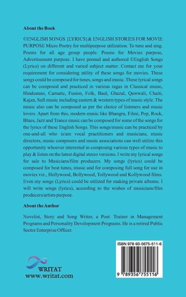 ©ENGLISH SONGS {LYRICS} & ENGLISH STORIES FOR MOVIE PURPOSE Micro Poetry for multipurpose utilization. To tune and sing. Poems for all age group people. Poems for Movies purpose, Advertisement purpose. I have penned and authored ©English Songs (Lyrics) on different and varied subject matter. Contact me for your requirement for considering utility of these songs for movies. These songs could be composed for tunes, songs and music. These lyrical songs can be composed and practiced in various ragas in Classical music, Hindustani, Carnatic, Fusion, Folk, Baul, Ghazal, Qawwali, Chaiti, Kajan, Sufi music including eastern & western types of music style. The music also can be composed as per the choice of listeners and music lovers. Apart from this, modern music like Bhangra, Filmi, Pop, Rock, Blues, Jazz and Trance music can be composed for some of the songs for the lyrics of these English Songs. This songs/music can be practiced by one-and-all who is/are vocal practitioners and musicians, music directors, music composers and music associations can well utilize this opportunity whoever interested in composing various types of music to play & listen on the latest digital stereo versions. I write my lyrical songs for sale to Musicians/film producers. My songs (lyrics) could be composed for best tunes, music and for composing full song for use in movies viz., Hollywood, Bollywood, Tollywood and Kollywood films. Even my songs (Lyrics) could be utilized for making private albums. I will write songs (lyrics), according to the wishes of musicians/film producers/artists purpose.