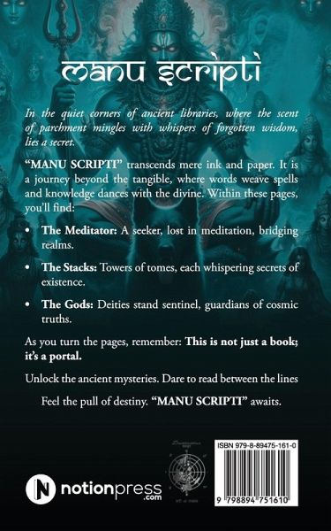In the quiet corners of ancient libraries, where the scent of parchment mingles with whispers of forgotten wisdom, lies a secret. "MANU SCRIPTI" transcends mere ink and paper. It is a journey beyond the tangible, where words weave spells and knowledge dances with the divine. Within these pages, you'll find: The Meditator: A seeker, lost in meditation, bridging realms. The Stacks: Towers of tomes, each whispering secrets of existence. The Gods: Deities stand sentinel, guardians of cosmic truths. As you turn the pages, remember: This is not just a book; it's a portal. Unlock the ancient mysteries. Dare to read between the lines Feel the pull of destiny. "MANU SCRIPTI" awaits.