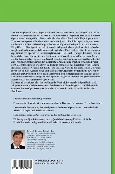 Um unnötige stationäre Liegezeiten und zunehmend auch den Kontakt mit resistenten Krankenhauskeimen zu vermeiden, werden mit steigender Tendenz ambulante Operationen durchgeführt. Das praxisorientierte Handbuch stellt die präoperativen Voraussetzungen und Maßnahmen sowie die jeweils Fach bezogenen Operationsmethoden und Nachbehandlungen der am häufigsten durchgeführten ambulanten Eingriffe vor. Das Spektrum reicht von der Allgemeinchirurgie über die Kinderchirurgie und weiteren spezialisierten chirurgischen Fachgebieten bis hin zu anderen eigenständigen operativen Fachdisziplinen wie HNO und Urologie. Darüber hinaus bezieht die Expertise der in den jeweiligen Fachbereichen jahrelang tätigen Autoren die für den ambulant operativen Bereich spezifischen Strukturproblematiken, die sich aus Praxisgegebenheiten wie der technischen Ausstattung ergeben, sowie die Fragen der Qualitätssicherung und deren Bedeutung gerade bei der Einhaltung von Hygienestandards mit ein. Abgerundet durchökonomische Aspekte der ambulanten Chirurgie sowie Tipps zum Aufbau einer ambulanten chirurgischen Praxisklinik bzw. einer ambulanten OP-Einheit bietet das Buch sowohl den niedergelassenen als auch den in der Klinik ambulant chirurgisch bzw. operativ tätigen Fachärzten ein praktisches und aktuelles 1x1 des ambulanten Operierens. Darüber hinaus eignet sich das vorliegende Werk nichtoperativ tätigen Fach- und Allgemeinärzten sowie interessierten Studenten die Grundzüge und die Philosophie des ambulanten Operierens anschaulich zu vermitteln und eventuelle Vorbehalte abzubauen.