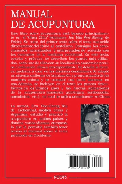 Este libro sobre acupuntura está basado principalmente en el "Chen Chiu". Se trata del primer texto sobre el tema traducido directamente del chino al castellano. Consigna los conocimientos actualizados e interpretados de acuerdo con los conceptos de la medicina occidental. En este texto, conciso y práctico, se describen los puntos más utilizados, cada uno de ellos con su localización anatómica precisa e indicación clínica correspondiente. Se detalla la técnica moderna a usar en las distintas condiciones. Se adoptó un sistema uniforme de latinización y pronunciación de los nombres chinos y se comparó con otros sistemas en uso. Además, se incluyen en el texto los puntos descubiertos en los últimos años y las nuevas aplicaciones de la acupuntura, tal cual se aplica actualmente en China. La autora, Dra. Pao-Cheng Niu de Liebenthal, médica china y argentina, estudió y practicó la acupuntura en ambos países desde 1967 a 1998.