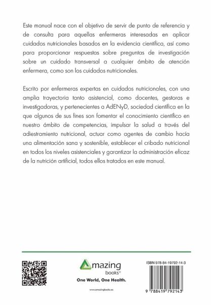 Es un hecho constatado que la adopción de estilos de vida saludables (alimentación y actividad física) es determinante para alcanzar mejores condiciones de salud. Sin embargo, la habilidad para elegir una alimentación saludable es algo que ha de aprenderse, lo que hace necesaria la educación nutricional de la población, encaminada a instaurar pautas de conducta alimentaria que ayuden al individuo a mantener su salud y su calidad de vida. Por otra parte, y en el momento actual, la nutrición está en un primer plano como herramienta para promover y mantener la salud al ser un determinante de enfermedades crónicas que puede ser modificado. En este sentido, la sociedad dispone de más alimentos de los que le es posible consumir lo que unido a la publicidad imperante sobre supuestos beneficios para la salud de determinados productos hace que la población pueda encontrar dificultadespara distinguir recomendaciones válidas de consejos engañosos.Ante esta situación se debe, desde la consulta de enfermería y a través de las actividades de prevención y promoción de la salud, llevar a cabo cuidados nutricionales dirigidos a mejorar los hábitos alimentarios y de estilo de vida de la población. Dado que el pensamiento enfermero considera la alimentación un cuidado básico y un requisito universal necesarios para mantener la salud y la calidad de vida, determina la responsabilidad de las enfermeras en la aplicación de cuidados nutricionales en todas las etapas del proceso de atención a las personas.De igual modo, las personas de mayor edad son un colectivo muy vulnerable al riesgo nutricional y aparición de la desnutrición relacionada con la enfermedad (DRE), por lo que la aplicación de herramientas de cribado, tanto en la atención hospitalaria como en la sociosanitaria, permitirían detectar precozmente situaciones de desnutrición o de riesgo nutricional. Sin embargo, con demasiada frecuencia, la desnutrición pasa desapercibida ante los profesionales sanitarios por falta de conocimientos y/o falta de formación e, incluso, de falta concienciación y de entrenamiento.Este manual nace con el objetivo de servir de punto de referencia y de consulta para aquellas enfermeras interesadas en aplicar cuidados nutricionales basados en la evidencia científica, así como para proporcionar respuestas sobre preguntas de investigación sobre un cuidado transversal a cualquier ámbito de atención enfermera, como son los cuidados nutricionales.Escrito por enfermeras expertas en cuidados nutricionales, con una amplia trayectoria tanto asistencial, como docentes, gestoras e investigadoras, y pertenecientes a AdENyD, sociedad científica en la que algunos de sus fines son fomentar el conocimiento científico en nuestro ámbito de competencias, impulsar la salud a través del adiestramiento nutricional, actuar como agentes de cambio hacía una alimentación sana y sostenible, establecer el cribado nutricional en todos los niveles asistenciales y garantizar la administración eficaz de la nutrición artificial, todos ellos tratados en este manual.
