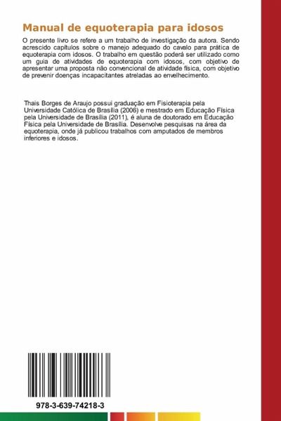 O presente livro se refere a um trabalho de investigação da autora. Sendo acrescido capítulos sobre o manejo adequado do cavalo para prática de equoterapia com idosos. O trabalho em questão poderá ser utilizado como um guia de atividades de equoterapia com idosos, com objetivo de apresentar uma proposta não convencional de atividade física, com objetivo de prevenir doenças incapacitantes atreladas ao envelhecimento.