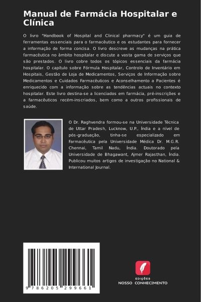 O livro "Handbook of Hospital and Clinical pharmacy" é um guia de ferramentas essenciais para o farmacêutico e os estudantes para fornecer a informação de forma concisa. O livro descreve as mudanças na prática farmacêutica no âmbito hospitalar e discute a vasta gama de serviços que são prestados. O livro cobre todos os tópicos essenciais da farmácia hospitalar. O capítulo sobre Fórmula Hospitalar, Controlo de Inventário em Hospitais, Gestão de Loja de Medicamentos, Serviços de Informação sobre Medicamentos e Cuidados Farmacêuticos e Aconselhamento a Pacientes é enriquecido com a informação sobre as tendências actuais no contexto hospitalar. Este livro destina-se a licenciados em farmácia, pré-inscrições e a farmacêuticos recém-inscriados, bem como a outros profissionais de saúde.