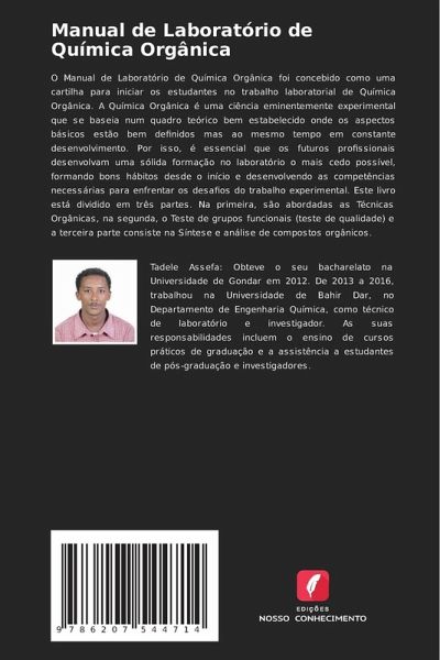 O Manual de Laboratório de Química Orgânica foi concebido como uma cartilha para iniciar os estudantes no trabalho laboratorial de Química Orgânica. A Química Orgânica é uma ciência eminentemente experimental que se baseia num quadro teórico bem estabelecido onde os aspectos básicos estão bem definidos mas ao mesmo tempo em constante desenvolvimento. Por isso, é essencial que os futuros profissionais desenvolvam uma sólida formação no laboratório o mais cedo possível, formando bons hábitos desde o início e desenvolvendo as competências necessárias para enfrentar os desafios do trabalho experimental. Este livro está dividido em três partes. Na primeira, são abordadas as Técnicas Orgânicas, na segunda, o Teste de grupos funcionais (teste de qualidade) e a terceira parte consiste na Síntese e análise de compostos orgânicos.
