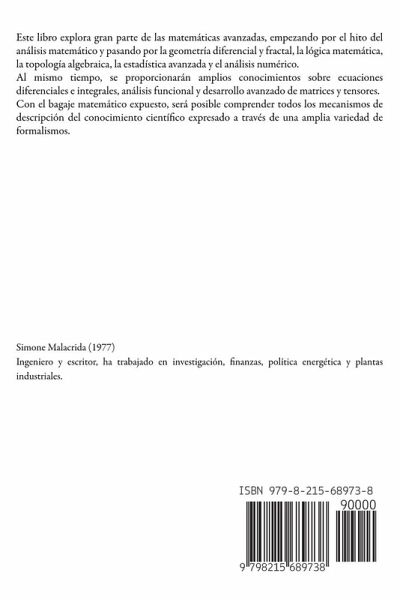 Este libro explora gran parte de las matemáticas avanzadas, empezando por el hito del análisis matemático y pasando por la geometría diferencial y fractal, la lógica matemática, la topología algebraica, la estadística avanzada y el análisis numérico. Al mismo tiempo, se proporcionarán amplios conocimientos sobre ecuaciones diferenciales e integrales, análisis funcional y desarrollo avanzado de matrices y tensores. Con el bagaje matemático expuesto, será posible comprender todos los mecanismos de descripción del conocimiento científico expresado a través de una amplia variedad de formalismos.