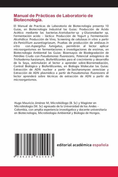 El Manual de Practicas de Laboratorio de Biotecnología presenta 10 Guías, en Biotecnología Industrial las Guías: Producción de Ácido Acético mediante las bacterias Acetobacter sp y Gluconobacter sp, Fermentación acido ¿ láctica: Producción de Yogurt y Fermentación Alcohólica: Producción de Vino, Screening de celulasas in vitro a partir de Penicillium aurantiogriseum, Pruebas de producción de amilasas in vitro con Aspergillus fumigatus, permitirán al lector aplicar microorganismos en fermentaciones e investigaciones de enzimas, en Biotecnología Ambiental las Guías: Bioensayos de Biodegradación de Petróleo Crudo con Pseudomonas fluorescens, Potencial antagónico de Trichoderma harzianum, Biofertilizantes para el crecimiento y desarrollo de la Soya, estimularán al lector a aprender sobre Biorremediación, Control Biológico y Biofertilizantes, en Biología Molecular las Guías: Extracción de ADN nuclear a partir de Saccharomyces cerevisiae y Extracción de ADN plasmídico a partir de Pseudomonas fluorescens el lector aprenderá sobre técnicas de extracción de ADN a partir de microorganismos.