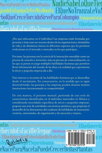 ¿Por qué enfocarnos en el individuo? Las empresas están formadas por personas y éstas usan sus recursos dentro de las organizaciones, dotándolas de vida y de dinámicas únicas en diferentes aspectos que les permiten evolucionar en el mercado o mercados en los que participan. Por tanto, las personas son la esencia de la innovación entendido como un proceso de creación o invención, más un proceso de comercialización, en los que se ponen en juego múltiples habilidades humanas que permiten llevar información del mundo de las ideas a la realidad que experimenta la micro y pequeña empresa día a día. Para innovar se necesitan de las habilidades humanas que se desarrollan desde el nacimiento. En consecuencia, en la medida que se sigan desenvolviendo, las personas y las empresas pueden alcanzar mejores innovaciones incrementando su competitividad. De esta manera, el presente manual, partiendo de una serie de características identificadas en el individuo innovador en México y considerando necesidades específicas de micro y pequeñas empresas, propone una serie de actividades con técnicas sistémicas, que propician el desarrollo de las dimensiones del cuadrante de habilidades de innovación: creativas, emocionales, de organización y de ejecución y mejora.