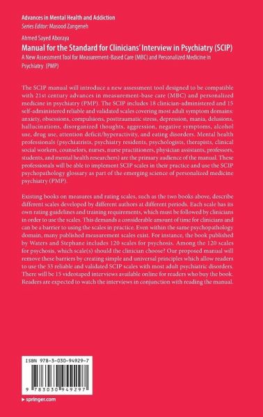 The SCIP manual will introduce a new assessment tool designed to be compatible with 21st century advances in measurement-base care (MBC) and personalized medicine in psychiatry (PMP). The SCIP includes 18 clinician-administered and 15 self-administered reliable and validated scales covering most adult symptom domains: anxiety, obsessions, compulsions, posttraumatic stress, depression, mania, delusions, hallucinations, disorganized thoughts, aggression, negative symptoms, alcohol use, drug use, attention deficit/hyperactivity, and eating disorders. Mental health professionals (psychiatrists, psychiatry residents, psychologists, therapists, clinical social workers, counselors, nurses, nurse practitioners, physician assistants, professors, students, and mental health researchers) are the primary audience of the manual. These professionals will be able to implement SCIP scales in their practice and use the SCIP psychopathology glossary as part of the emerging science of personalized medicine psychiatry (PMP).