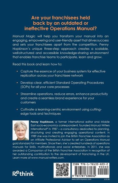 Penny Hopkinson, a former international editor and Middle East socio-economics correspondent, founded Manual Writers International(R) in 1987 - a consultancy dedicated to planning, structuring and creating engaging operational content. In 1989 she was invited to join the British Franchise Association as an Affiliate Professional Advisor to set an Operations Manual gold standard for members. Since then, she's created hundreds of operations manuals for SMEs, multinationals and social enterprises. In 2011, she was awarded a Companion of the British Franchise Association in recognition of her outstanding contribution to the development of franchising in the UK. Learn more at www.manual-writers.com