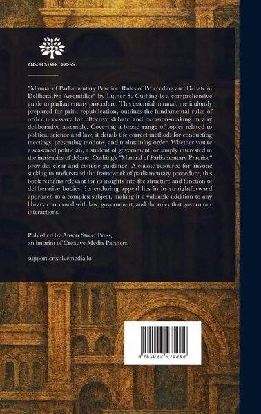 "Manual of Parliamentary Practice: Rules of Proceeding and Debate in Deliberative Assemblies" by Luther S. Cushing is a comprehensive guide to parliamentary procedure. This essential manual, meticulously prepared for print republication, outlines the fundamental rules of order necessary for effective debate and decision-making in any deliberative assembly. Covering a broad range of topics related to political science and law, it details the correct methods for conducting meetings, presenting motions, and maintaining order. Whether you're a seasoned politician, a student of government, or simply interested in the intricacies of debate, Cushing's "Manual of Parliamentary Practice" provides clear and concise guidance. A classic resource for anyone seeking to understand the framework of parliamentary procedure, this book remains relevant for its insights into the structure and function of deliberative bodies. Its enduring appeal lies in its straightforward approach to a complex subject, making it a valuable addition to any library concerned with law, government, and the rules that govern our interactions. This work has been selected by scholars as being culturally important, and is part of the knowledge base of civilization as we know it. This work is in the public domain in the United States of America, and possibly other nations. Within the United States, you may freely copy and distribute this work, as no entity (individual or corporate) has a copyright on the body of the work. Scholars believe, and we concur, that this work is important enough to be preserved, reproduced, and made generally available to the public. We appreciate your support of the preservation process, and thank you for being an important part of keeping this knowledge alive and relevant.