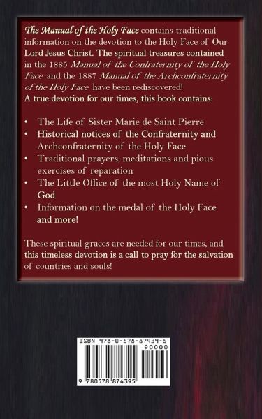 The Manual of the Holy Face contains traditional information on the devotion to the Holy Face of Our Lord, Jesus Christ. The spiritual treasures contained in the 1885 Manual of the Confraternity of the Holy Face and the 1887 Manual of the Archconfraternity of the Holy Face have been rediscovered! A true devotion for our times, this book contains: The Life of Sister Marie de Saint Pierre Historical notices of the Confraternity and Archconfraternity of the Holy Face Traditional prayers, meditations, and pious exercises of reparation The Little Office of the Holy Name of God Information on the medal of the Holy Face and more! These spiritual graces are needed for our times, and this timeless devotion is a call to pray for the salvation of countries and souls!