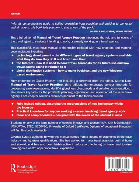 Now in its third edition, this successful must-have manual is thoroughly updated with new chapters and material, covering issues including:* Technology development - the different types of travel agency systems available, what they do, how they do it and how to use them* The Internet - how it is used to book travel, forecasts for its future use and how travel agenets stand in relation to it* Global distribution systems - how to make bookings, and the new windows-based environment* A full endorsement by Travel Weekly The manual demonstrates correct methods for processing travel reservations, identifying business client needs and suitable documentation. It also shows key facts for the profitable planning, organization and operation of the retail travel agency. Each chapter contains exercises pertinent to the topics covered.Students on any of the large number of courses in travel and tourism (ICM, City & Guilds, ABTA, IATA, UFTAA, BTEC, SCOTVEC, University of Oxford Certificate, Diploma of Vocational Education) will find this book invaluable.