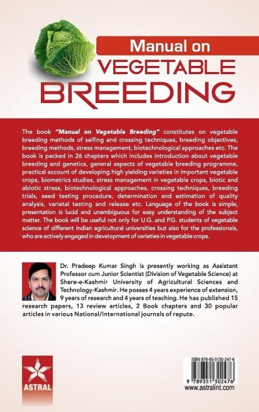 The book manual on Vegetable breeding constitutes on vegetable breeding methods of selfing and crossing techniques, breeding objectives, breeding methods, stress management, biotechnological approaches etc. the whole book is packed in 29 chapters which includes introduction about vegetable breeding and genetics general aspects of vegetable breeding programme, practical account of developing high yielding varieties in important vegetable crops, biometries studies, stress management in vegetable crops biotic and abiotic stress, biotechnological approaches, crossing techniques, breeding trials, seed testing procedure, determination and estimation of quality analysis, varietal testing and release etc. in most lucid and simple manner understandable to students while treating the subject, the interested students will find easy access to there once they go through the selected list of references. The book will serve as text book for useful not only to the graduate students of agricultural universities of India as a ready reckoner for the professionals, who are actively engaged in development of varieties in vegetable crops.