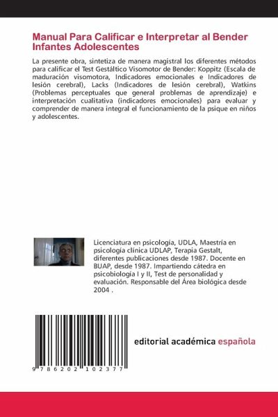 La presente obra, sintetiza de manera magistral los diferentes métodos para calificar el Test Gestáltico Visomotor de Bender: Koppitz (Escala de maduración visomotora, Indicadores emocionales e Indicadores de lesión cerebral), Lacks (Indicadores de lesión cerebral), Watkins (Problemas perceptuales que general problemas de aprendizaje) e interpretación cualitativa (indicadores emocionales) para evaluar y comprender de manera integral el funcionamiento de la psique en niños y adolescentes.