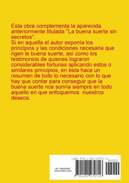 Esta obra complementa la aparecida anteriormente titulada "La buena suerte sin secretos". Si en aquella el autor exponía los principios y las condiciones necesarias que rigen la buena suerte, así como los testimonios de quienes lograron considerables fortunas aplicando estos o similares principios, en ésta hace un resumen de todo lo necesario con lo que hay que contar para conseguir que la buena suerte nos sonría siempre en todo aquello en que enfoquemos nuestros deseos.