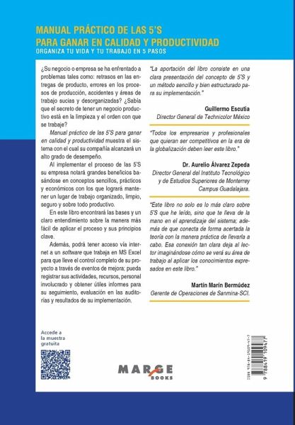 ¿Su negocio o empresa se ha enfrentado a problemas tales como: retrasos en las entregas de producto, errores en los procesos de producción, accidentes y áreas de trabajo sucias y desorganizadas? ¿Sabía que el secreto de tener un negocio productivo está en la limpieza y el orden con que se trabaje? Manual práctico de las 5'S para ganar en calidad y productividad muestra el sistema con el cual su compañía alcanzará un alto grado de desempeño. Al implementar el proceso de las 5'S su empresa notará grandes beneficios basándose en conceptos sencillos, prácticos y económicos con los que logrará mantener un lugar de trabajo organizado, limpio, seguro y sobre todo productivo. En este libro encontrará las bases y un claro entendimiento sobre la manera más fácil de aplicar el proceso y sus principios clave. Además, podrá tener acceso vía internet a un software que trabaja en MS Excel para que lleve el control completo de su proyecto a través de eventos de mejora; pueda registrar sus actividades, recursos, personal involucrado y obtener útiles informes para su seguimiento, evaluación en las auditorías y resultados de su implementación.