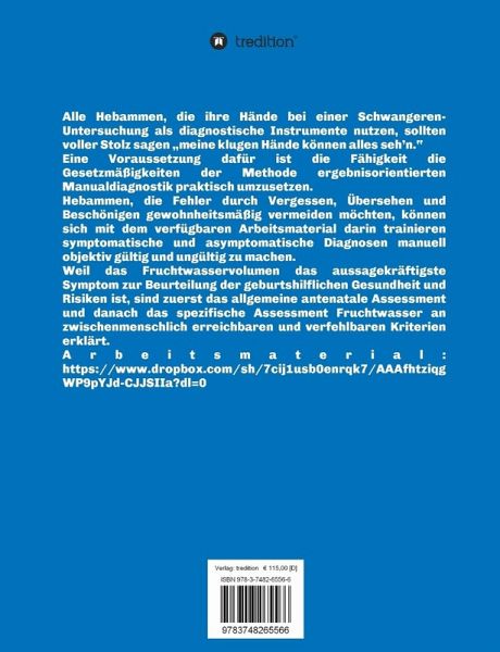 Dieses Buch ist ein Grundlagenwerk für Hebammen, die sich und den von ihnen betreuten schwangeren Frauen Sinn und Bedeutung der manuellen Untersuchung erklären möchten. Das Motto des Buches ist: "sind so kluge Hände - können alles seh'n, haben endlich Bild und Sprache - um das Können zu versteh'n." Konzepte, Bilder, Tabellen und Anleitungen zeigen die Handlungsabfolgen einer Schwangeren-Untersuchung, deren Ziel eine objektive Diagnose ist. Basis der Erklärungen sind naturwissenschaftliche Erkenntnisse zu Richtungen und Messpunkten. Tasten ist nicht mehr allein Kunst, Intuition und jahrelange Erfahrung, sondern ein praktisch erlernbares Können, bei dem bekannte Handgriffe qualitativ weiterentwickelt und die neu entwickelten Techniken dann mit Blick auf das angestrebte Ergebnis "Menge des Fruchtwassers in Deziliter einschätzen" ausgeführt werden. Am Beispiel eines vermeintlich zu geringen Fruchtwasservolumens wird erklärt, wie eine aussagekräftige Tast-Diagnose hergestellt wird. Es wird gezeigt, wie die manuelle Diagnostik die Schwangerenbetreuung verbessert und das Vertrauen der Frauen in die Hebammenkompetenz stärkt. Hebammen, die Tasten mit den erklärten Techniken einüben, lernen, ihrer Fähigkeit manuell zu untersuchen, besser zu vertrauen, da sie Sonografie-Ergebnisse ungültig und gültig machen können, indem sie ihre ertasteten Befunde fachlich angemessen begründen. Hebammen, die diese Chance nutzen, können sich die Fähigkeiten der ergebnisorientierten Manualdiagnostik aneignen, um sich wettbewerbsstrategisch vorteilhafte Perspektiven am Markt zu eröffnen. Global erstmals ist die originäre Hebammendiagnostik so beschrieben, dass sich ihr Wert als ein für die Menschheit wertvolles Kulturgut zeigt.