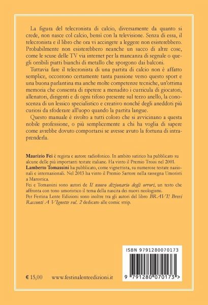 La figura del telecronista di calcio, diversamente da quanto si crede, non nasce col calcio, bensì con la televisione. Senza di essa, il telecronista e anche questo libro non esisterebbero. Anzi, a dire il vero, probabilmente non esisterebbero neanche un sacco di altre cose, come le scuse delle TV via internet per la mancanza di segnale o quegli orribili piatti bianchi di metallo che sporgono dai balconi. Tuttavia fare il telecronista di una partita di calcio non è affatto semplice, occorrono certamente tanta passione verso questo sport e una buona parlantina ma anche molte competenze tecniche, un'ottima memoria che consenta di ripetere a menadito i curricula di giocatori, allenatori, dirigenti e di ogni tifoso presente sul terzo anello, la conoscenza di un lessico specialistico e creativo nonché un repertorio degli aneddoti più curiosi e intriganti da sfoderare all'uopo quando la partita langue. Questo manuale è rivolto a tutti coloro che si avvicinano a questa nobile professione, o più semplicemente a chi ha voglia di sapere come avrebbe dovuto comportarsi se avesse avuto la fortuna di intraprenderla.