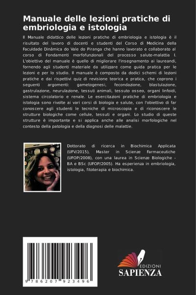 Il Manuale didattico delle lezioni pratiche di embriologia e istologia è il risultato del lavoro di docenti e studenti del Corso di Medicina della Faculdade Dinâmica do Vale do Piranga che hanno lavorato e collaborato al corso di Fondamenti morfofunzionali del processo salute-malattia I. L'obiettivo del manuale è quello di migliorare l'insegnamento ai laureandi, fornendo agli studenti materiale da utilizzare come guida pratica per le lezioni e per lo studio. Il manuale è composto da dodici schemi di lezioni pratiche e dai rispettivi quiz di revisione teorica e pratica, che coprono i seguenti argomenti: gametogenesi, fecondazione, blastulazione, gastrulazione, neurulazione, tessuti animali, tessuto osseo, organi linfoidi, sistema circolatorio e renale. Le esercitazioni pratiche di embriologia e istologia sono rivolte ai vari corsi di biologia e salute, con l'obiettivo di far conoscere agli studenti le tecniche di microscopia e di riconoscere le strutture biologiche come cellule, tessuti e organi. Lo studio di queste strutture è importante e si applica anche alle analisi morfologiche nel contesto della patologia e della diagnosi delle malattie.