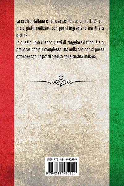 La cucina italiana è famosa per la sua semplicità, con molti piatti realizzati con pochi ingredienti ma di alta qualità. In questo libro ci sono piatti di maggiore difficoltà e di preparazione più complessa, ma nulla che non possa essere realizzato con un po' di pratica nella cucina italiana.