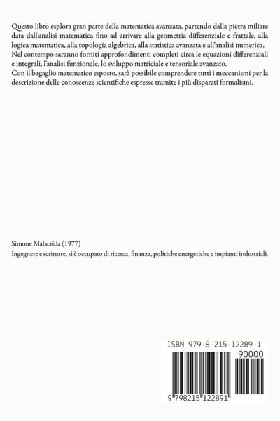 Questo libro esplora gran parte della matematica avanzata, partendo dalla pietra miliare data dall'analisi matematica fino ad arrivare alla geometria differenziale e frattale, alla logica matematica, alla topologia algebrica, alla statistica avanzata e all'analisi numerica. Nel contempo saranno forniti approfondimenti completi circa le equazioni differenziali e integrali, l'analisi funzionale, lo sviluppo matriciale e tensoriale avanzato. Con il bagaglio matematico esposto, sarà possibile comprendere tutti i meccanismi per la descrizione delle conoscenze scientifiche espresse tramite i più disparati formalismi.
