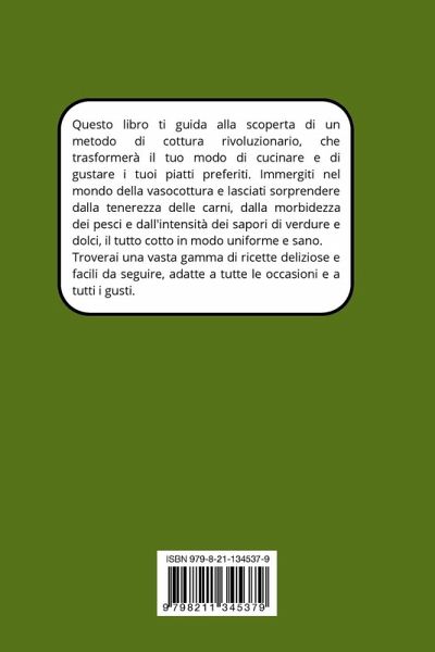 Questo libro ti guida alla scoperta di un metodo di cottura rivoluzionario, che trasformerà il tuo modo di cucinare e di gustare i tuoi piatti preferiti. Immergiti nel mondo della vasocottura e lasciati sorprendere dalla tenerezza delle carni, dalla morbidezza dei pesci e dall'intensità dei sapori di verdure e dolci, il tutto cotto in modo uniforme e sano. Troverai una vasta gamma di ricette deliziose e facili da seguire, adatte a tutte le occasioni e a tutti i gusti.