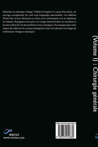 Ce livre classique a été initialement publié il y a des décennies sous le titre ""Manual of Surgery (Volume I): General Surgery"" . Il a maintenant été traduit par Writat en langue française pour leurs lecteurs francophones. Chez Writat, nous sommes passionnés par la préservation du patrimoine littéraire du passé. Nous avons traduit ce livre en français afin que les générations présentes et futures puissent le lire et le conserver.