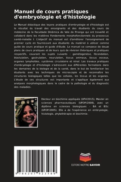 Le Manuel didactique des leçons pratiques d'embryologie et d'histologie est le résultat du travail des enseignants et des étudiants du cours de médecine de la Faculdade Dinâmica do Vale do Piranga qui ont travaillé et collaboré dans les matières Fondements morphofonctionnels du processus santé-maladie I. L'objectif du manuel est d'améliorer l'enseignement de premier cycle en fournissant aux étudiants du matériel à utiliser comme guide de cours pratique et guide d'étude. Le manuel se compose de douze plans de cours pratiques et de leurs quiz de révision théoriques et pratiques respectifs, couvrant les sujets suivants : gamétogenèse, fécondation, blastulation, gastrulation, neurulation, tissus animaux, tissus osseux, organes lymphoïdes, systèmes circulatoire et rénal. Les travaux pratiques d'embryologie et d'histologie s'adressent aux différentes formations dans les domaines de la biologie et de la santé, dans le but de familiariser les étudiants avec les techniques de microscopie et de reconnaître les structures biologiques telles que les cellules, les tissus et les organes. L'étude de ces structures est importante et s'applique également aux analyses morphologiques dans le cadre de la pathologie et du diagnostic des maladies.