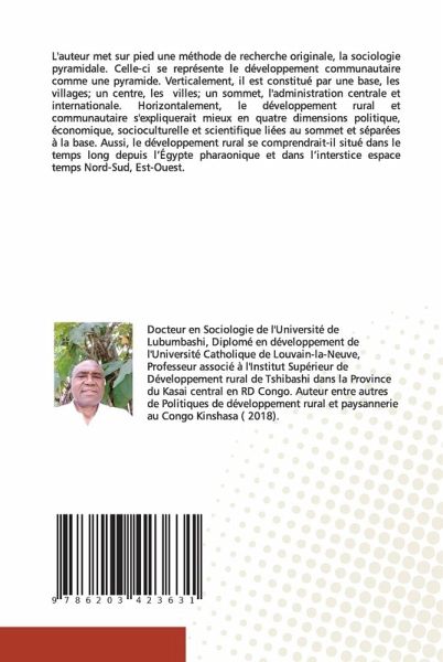 L'auteur met sur pied une méthode de recherche originale, la sociologie pyramidale. Celle-ci se représente le développement communautaire comme une pyramide. Verticalement, il est constitué par une base, les villages; un centre, les villes; un sommet, l'administration centrale et internationale. Horizontalement, le développement rural et communautaire s'expliquerait mieux en quatre dimensions politique, économique, socioculturelle et scientifique liées au sommet et séparées à la base. Aussi, le développement rural se comprendrait-il situé dans le temps long depuis l'Égypte pharaonique et dans l'interstice espace temps Nord-Sud, Est-Ouest.