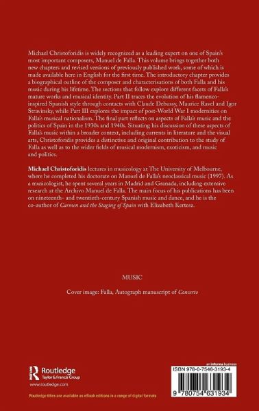 Michael Christoforidis is widely recognized as a leading expert on one of Spain's most important composers, Manuel de Falla. This volume brings together both new chapters and revised versions of previously published work, some of which is made available here in English for the first time. Three comprehensive sections explore different facets of Falla's mature works and musical identity. Christoforidis provides a distinctive and original contribution to the study of Falla, as well as to the wider fields of musical modernism, exoticism, and music and politics.