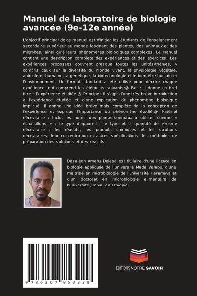 L'objectif principal de ce manuel est d'initier les étudiants de l'enseignement secondaire supérieur au monde fascinant des plantes, des animaux et des microbes, ainsi qu'à leurs phénomènes biologiques complexes. Le manuel contient une description complète des expériences et des exercices. Les expériences proposées couvrent presque toutes les unités/thèmes, y compris ceux sur la diversité du monde vivant, la physiologie végétale, animale et humaine, la génétique, la biotechnologie et le bien-être humain et l'environnement. Un format standard a été utilisé pour décrire chaque expérience, qui comprend les éléments suivants:@ But : il donne un bref titre à l'expérience étudiée.@ Principe : il s'agit d'une très brève introduction à l'expérience étudiée et d'une explication du phénomène biologique impliqué. Il donne une idée brève mais complète de la conception de l'expérience et explique l'importance du phénomène étudié.@ Matériel nécessaire : Inclut les noms des plantes/animaux à utiliser comme « échantillons » ; le type d'appareil ; le type et la quantité de verrerie nécessaire ; les réactifs, les produits chimiques et les solutions nécessaires, leur concentration et autres spécifications, les méthodes de préparation des solutions et des réactifs.