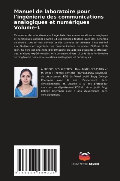 Ce manuel de laboratoire sur l'ingénierie des communications analogiques et numériques contient environ 14 expériences testées avec des schémas de circuits, des formes d'ondes et des colonnes de tableaux. Il est destiné aux étudiants en ingénierie des communications de niveau Diplôme et B-Tech. Ce livre est une mine d'informations qui aide les étudiants à effectuer des analyses expérimentales et à concevoir divers circuits dans le domaine de l'ingénierie des communications analogiques et numériques.