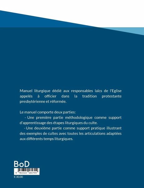 Manuel liturgique dédié aux responsables laïcs de l'Eglise appelés à officier dans la tradition protestante presbytérienne et réformée.Le manuel comporte deux parties: -Une première partie méthodologique comme support d'apprentissage des étapes liturgiques du culte. -Une deuxième partie comme support pratique illustrant des exemples de cultes avec toutes les articulations adaptées aux différents temps liturgiques.