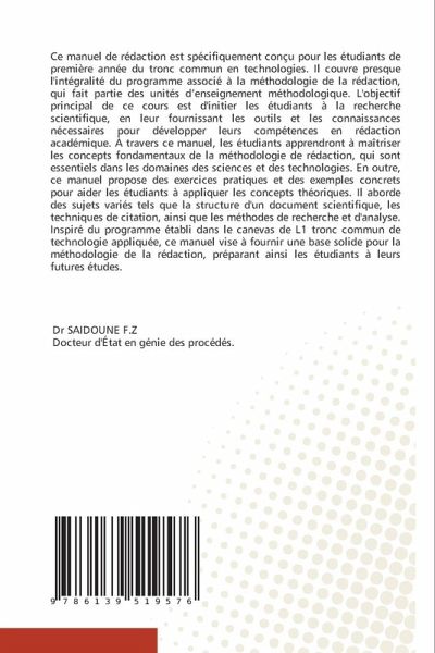 Ce manuel de rédaction est spécifiquement conçu pour les étudiants de première année du tronc commun en technologies. Il couvre presque l'intégralité du programme associé à la méthodologie de la rédaction, qui fait partie des unités d'enseignement méthodologique. L'objectif principal de ce cours est d'initier les étudiants à la recherche scientifique, en leur fournissant les outils et les connaissances nécessaires pour développer leurs compétences en rédaction académique. À travers ce manuel, les étudiants apprendront à maîtriser les concepts fondamentaux de la méthodologie de rédaction, qui sont essentiels dans les domaines des sciences et des technologies. En outre, ce manuel propose des exercices pratiques et des exemples concrets pour aider les étudiants à appliquer les concepts théoriques. Il aborde des sujets variés tels que la structure d'un document scientifique, les techniques de citation, ainsi que les méthodes de recherche et d'analyse. Inspiré du programme établi dans le canevas de L1 tronc commun de technologie appliquée, ce manuel vise à fournir une base solide pour la méthodologie de la rédaction, préparant ainsi les étudiants à leurs futures études.