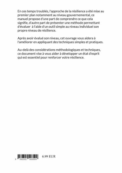 En ces temps troublés, l'approche de la résilience a été mise au premier plan notamment au niveau gouvernemental, ce manuel propose d'une part de comprendre ce que cela signifie, d'autre part de présenter une méthode permettant d'évaluer à l'aide d'un outil simple au niveau individuel son propre niveau de résilience. Après avoir évalué son niveau, cet ouvrage vous aidera à l'améliorer en appliquant des techniques simples et pratiques. Au-delà des considérations méthodologiques et techniques, ce document vise à vous aider à développer un état d'esprit qui est essentiel pour renforcer votre résilience.