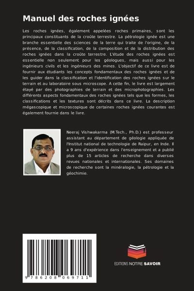 Les roches ignées, également appelées roches primaires, sont les principaux constituants de la croûte terrestre. La pétrologie ignée est une branche essentielle des sciences de la terre qui traite de l'origine, de la présence, de la classification, de la composition et de la distribution des roches ignées dans la croûte terrestre. L'étude des roches ignées est essentielle non seulement pour les géologues, mais aussi pour les ingénieurs civils et les ingénieurs des mines. L'objectif de ce livre est de fournir aux étudiants les concepts fondamentaux des roches ignées et de les guider dans la classification et l'identification des roches ignées sur le terrain et au laboratoire sous microscope. A cette fin, le livre est largement étayé par des photographies de terrain et des microphotographies. Les différents aspects fondamentaux des roches ignées tels que les formes, les classifications et les textures sont décrits dans ce livre. La description mégascopique et microscopique de certaines roches ignées courantes est également fournie dans le livre.