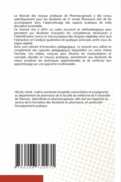 Le Manuel des travaux pratiques de Pharmacognosie a été conçu spécifiquement pour les étudiants de 3 année Pharmacie afin de les accompagner dans l'apprentissage des aspects pratiques de cette discipline essentielle.Ce manuel vise à offrir un cadre structuré et méthodologique pour permettre aux étudiants d'acquérir les compétences nécessaires à l'identification macro et microscopique des drogues végétales ainsi qu'à l'extraction et l'analyse qualitative de quelques principes actifs issus du règne végétal.Dans une volonté d'innovation pédagogique, ce manuel sera utilisé en complément des capsules pédagogiques disponibles sur notre chaîne YouTube. Ces vidéos, conçues pour illustrer les manipulations et concepts abordés en travaux pratiques, permettront aux étudiants de mieux visualiser les techniques expérimentales et de renforcer leur apprentissage par une approche multimodale.