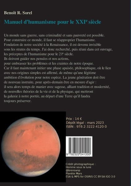Un monde sans guerre, sans criminalité et sans pauvreté est possible. Pour construire ce monde, il faut se réapproprier l'humanisme. Fondation de notre société à la Renaissance, il est devenu invisible sous les strates du temps.J'ai donc réuni dans cet ouvrage les préceptes de l'humanisme pour le 21e siècle. Ils doivent guider nos pensées et nos actions, pour embrasser pleinement les problèmes et les craintes de notre époque.Car il faut maintenant initier une phase apaisée, où le lien avec nos origines simples est affirmé, de même qu'une légitime ambition d'évolution pour notre espèce. La jeune génération doit être de nouveau instruite, pour être en mesure après-demain, d'agir : il sera alors temps de manier avec sagesse, alliant tradition et modernité, de nouvelles théories de la vie et de la physique, qui mettront la galaxie à notre portée, au départ d'une Terrer qu'il faudra toujours préserver.