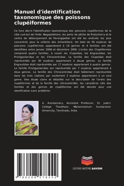 Ce livre décrit l'identification taxonomique des poissons clupéiformes de la côte sud-est de l'Inde. Nagapattinam, les ports de pêche de Puducherry et le centre de débarquement de Parangipettai ont été les endroits les plus concentrés pour la collecte des échantillons. Un total de 56 espèces de poissons clupéiformes appartenant à 19 genres et 4 familles ont été identifiées entre janvier 2008 et décembre 2009. L'ordre des Clupéiformes comprend quatre familles, à savoir les Clupeidae, les Engraulidae, les Pristigasteridae et les Chirocentridae. La famille des Clupeidae était représentée par 30 espèces appartenant à douze genres. La famille Engraulidae était représentée par 17 espèces appartenant à quatre genres. La famille Pristigasteridae est représentée par 7 espèces appartenant à deux genres. La famille des Chirocentridae était faiblement représentée dans les trois stations par seulement 2 espèces appartenant à un seul genre. Une étude claire et détaillée sur la description de l'ordre des clupéiformes et de la famille des chirocentridés, les caractères clés des familles et des genres de clupéiformes ont été donnés pour une identification sans problème.