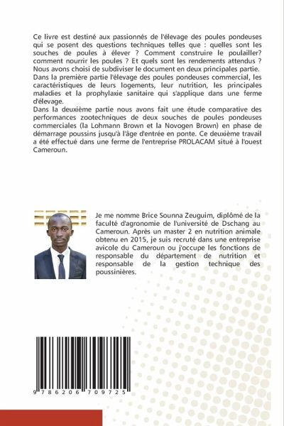 Ce livre est destiné aux passionnés de l'élevage des poules pondeuses qui se posent des questions techniques telles que : quelles sont les souches de poules à élever ? Comment construire le poulailler? comment nourrir les poules ? Et quels sont les rendements attendus ? Nous avons choisi de subdiviser le document en deux principales partie.Dans la première partie l'élevage des poules pondeuses commercial, les caractéristiques de leurs logements, leur nutrition, les principales maladies et la prophylaxie sanitaire qui s'applique dans une ferme d'élevage.Dans la deuxième partie nous avons fait une étude comparative des performances zootechniques de deux souches de poules pondeuses commerciales (la Lohmann Brown et la Novogen Brown) en phase de démarrage poussins jusqu'à l'âge d'entrée en ponte. Ce deuxième travail a été effectué dans une ferme de l'entreprise PROLACAM situé à l'ouest Cameroun.
