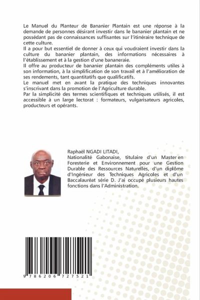 Le Manuel du Planteur de Bananier Plantain est une réponse à la demande de personnes désirant investir dans le bananier plantain et ne possédant pas de connaissances suffisantes sur l'itinéraire technique de cette culture.Il a pour but essentiel de donner à ceux qui voudraient investir dans la culture du bananier plantain, des informations nécessaires à l'établissement et à la gestion d'une bananeraie.Il offre au producteur de bananier plantain des compléments utiles à son information, à la simplification de son travail et à l'amélioration de ses rendements, tant quantitatifs que qualificatifs.Le manuel met en avant la pratique des techniques innovantes s'inscrivant dans la promotion de l'Agriculture durable.Par la simplicité des termes scientifiques et techniques utilisés, il est accessible à un large lectorat : formateurs, vulgarisateurs agricoles, producteurs et opérants.