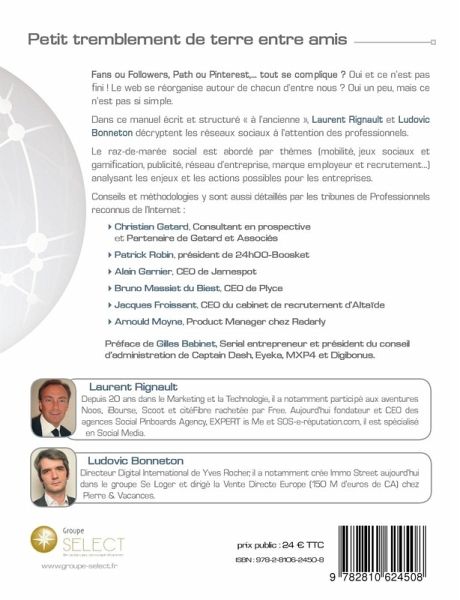 Fans ou Followers, Path ou Pinterest, ... tout se complique ? Oui et ce n'est pas fini !Le web se réorganise autour de chacun d'entre nous ? Oui un peu, mais ce n'est pas si simple.Dans ce manuel écrit et structuré « à l'ancienne », Laurent Rignault et Ludovic Bonneton décryptent les réseaux sociaux à l'attention des professionnels.Le raz-de-marée social est abordé par thèmes (mobilité, jeux sociaux et gamification, publicité, réseau d'entreprise, marque employeur et recrutement...) analysant les enjeux et les actions possibles pour les entreprises.Conseils et méthodologies y sont aussi détaillés par les tribunes de Professionnels reconnus de l'Internet :> Christian Gatard, Consultant en prospective et Partenaire de Gatard et Associés> Patrick Robin, président de 24h00-Boosket> Alain Garnier, CEO de Jamespot> Bruno Massiet du Biest, CEO de Plyce> Jacques Froissant, CEO du cabinet de recrutement d'Altaïde> Arnould Moyne, Product Manager chez RadarlyPréface de Gilles Babinet, Serial entrepreneur et président du conseil d'administration de Captain Dash, Eyeka, MXP4 et Digibonus.