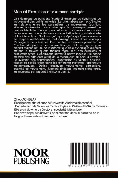 La mécanique du point est l'étude cinématique ou dynamique du mouvement des points matériels. La cinématique permet d'étudier les relations entre les paramètres du mouvement (position, vitesse, accélération, etc.), alors que la dynamique permet de prédire l'évolution de ces paramètres en connaissant les causes du mouvement. ou à distance comme l'attraction gravitationnelle et les interactions électromagnétiques. Après quelques exercices de rappels mathématiques, cet ouvrage introduit les concepts d'énergie et de puissance. Des nombreux exercices permettent à l'étudiant de parfaire son apprentissage. Cet ouvrage a pour objectif majeur l'étude de la cinématique et la dynamique du point matériel à travers quarts thèmes regroupant des exercices et problèmes types. Cet ouvrage permet à l'élève ingénieur la bonne maîtrise des différents outils de la mécanique du point à savoir :- Le système des coordonnées, l'expression du vecteur position, vitesse et accélération dans les différents systèmes ,opérateurs mathématiques.- Définir quelques mouvements particuliers, quantité de mouvement.- Moment cinétique, moment d'une force, les moments par rapport à un point donné.
